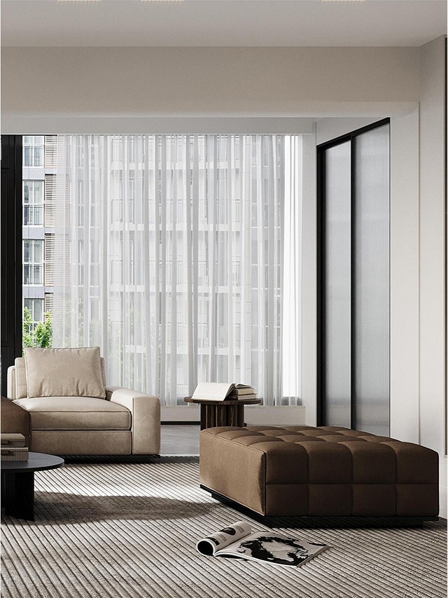 - 配色是灵魂:奶杏色沙发+焦糖色模块凳,软乎乎的温柔里掺了复古质感;黑胡