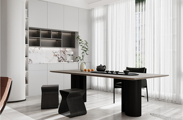 - 茶区:黑胡桃木长桌+异形矮凳,搭配茶具和枯枝花艺,把“中式茶席”搬进现