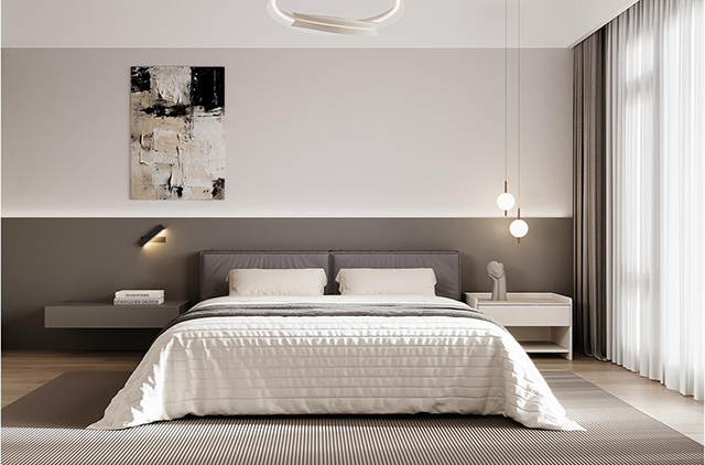 - 主卧:奶白软包床+半墙拼色,搭配悬浮床头柜+艺术挂画,温馨里裹着轻奢质