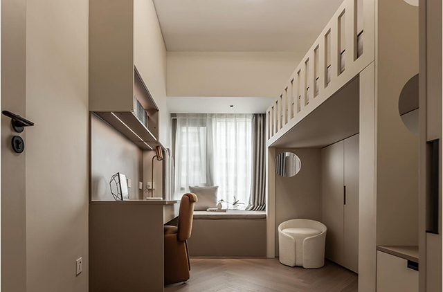 - 利用挑高做了loft式储物+书桌,悬浮书桌+线性灯,办公时光线刚好;窗边卡座