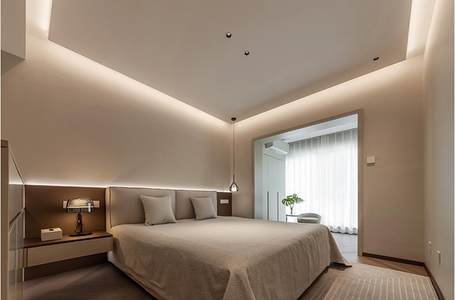 - 软包床头+奶杏床品,搭配半墙拼色+线性灯,温馨又不沉闷;悬浮床头柜+隐形