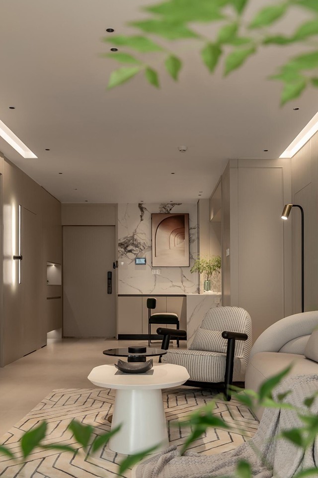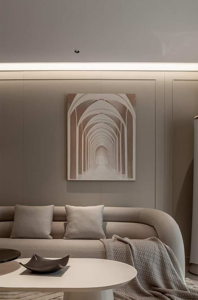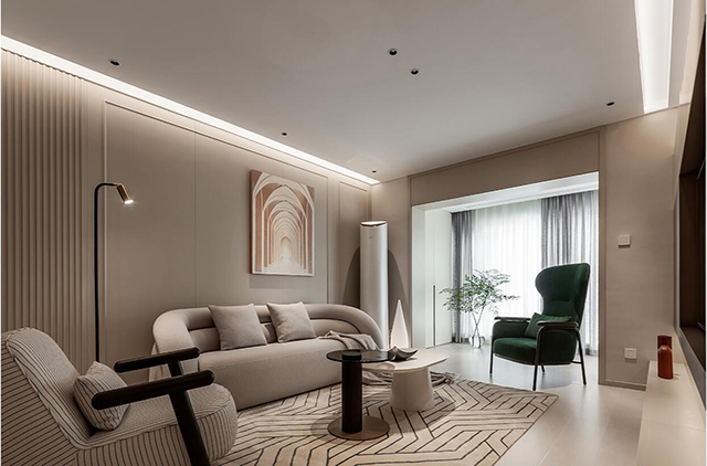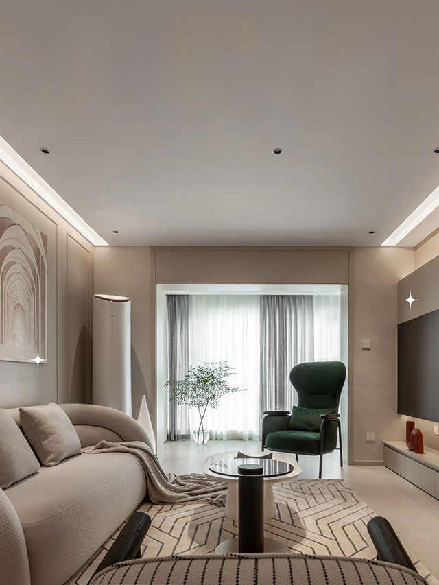 - 配色是温柔密码:奶杏色墙布+同色系弧形沙发,软乎乎的质感像陷进云朵里;