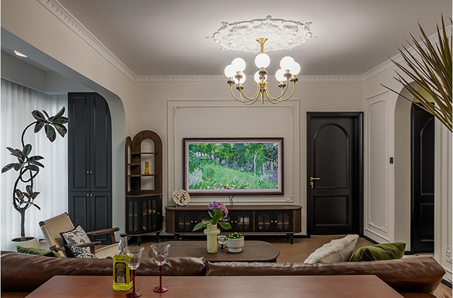 - 餐边柜/电视柜统一用深黑+黄铜拉手,玻璃柜门透出杯碟,复古贵气不闷;