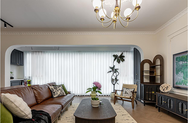 拱门+石膏线是灵魂!客厅和餐厨区用圆弧拱门做过渡,柔化了空间棱角;墙面石