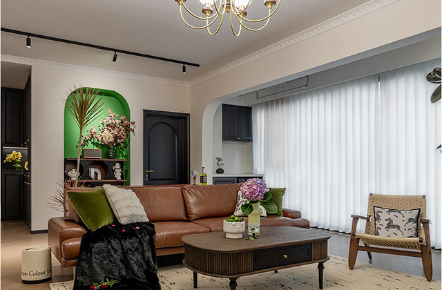 1. 线条要柔: 拱门、圆弧柜角、雕花石膏线,用曲线柔化复古厚重感;