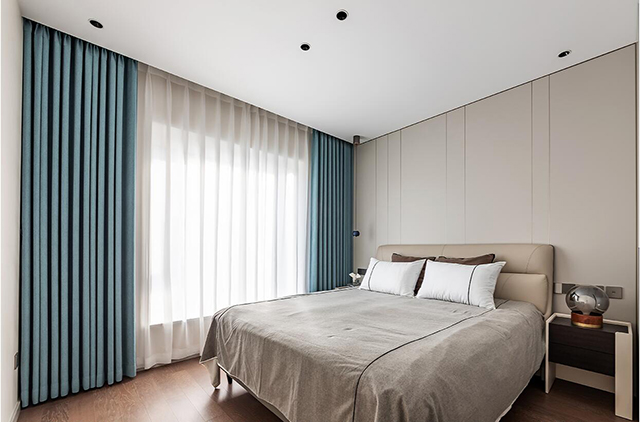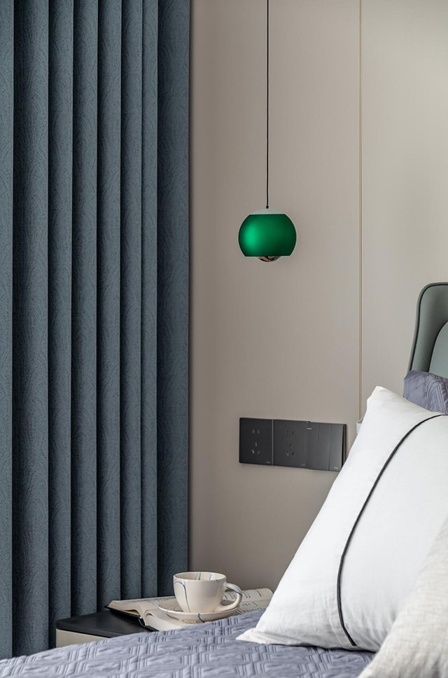浅灰床品+皮质软包床头,暖调裹满整个房间;落地窗配蓝绿丝绒帘,遮光又高级;