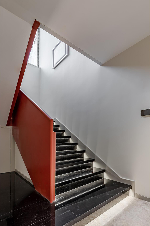黑色石材台阶+红色金属扶手,冷调里撞出亮眼细节;墙面挂艺术画,连上楼都像
