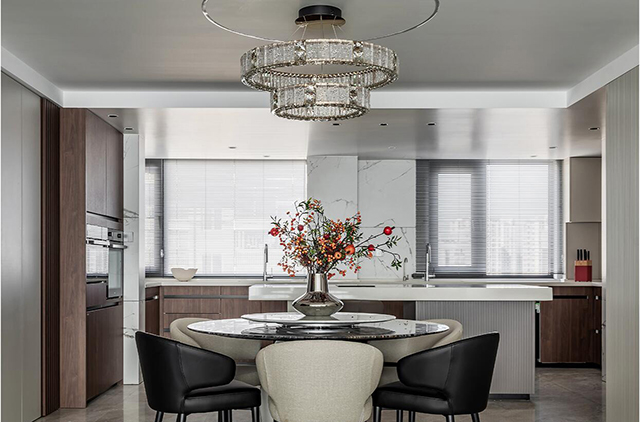 圆形大理石餐桌+黑/白拼色餐椅,搭水晶圆环吊灯,背景墙藏隐形柜,视觉干净