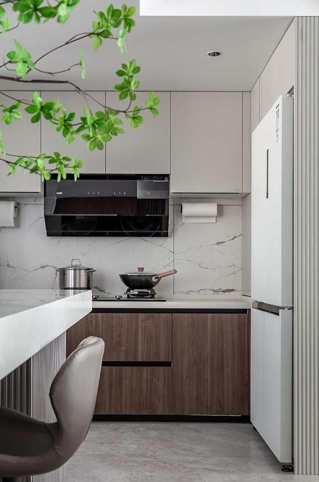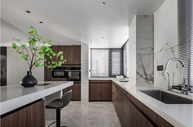 深胡桃木柜+白色大理石台面,金属拉手点睛;中岛台是轻盈利落的悬浮设计,不