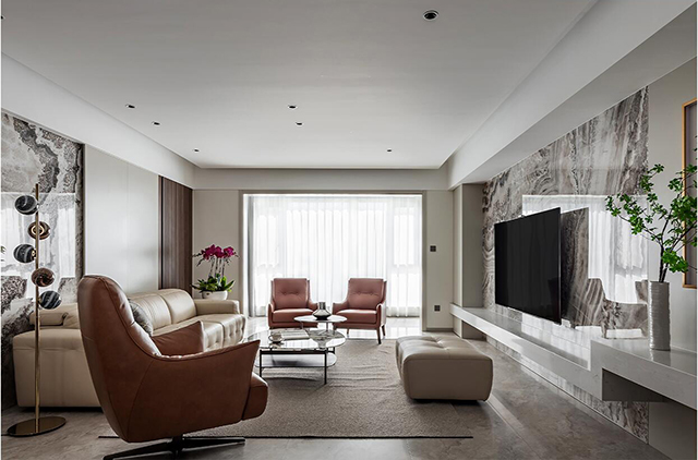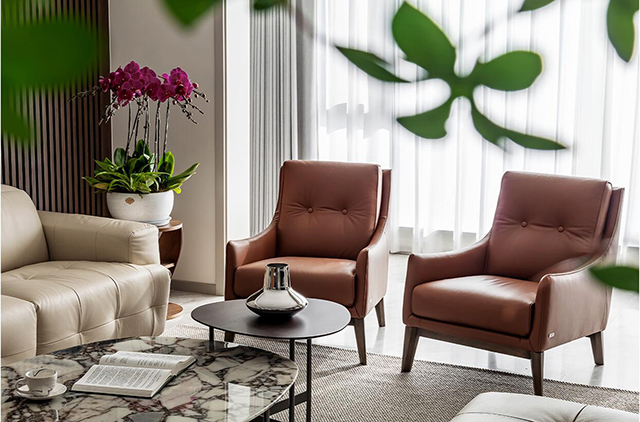 - 浅棕皮质沙发+焦糖色单椅,暖调中和大理石冷感;